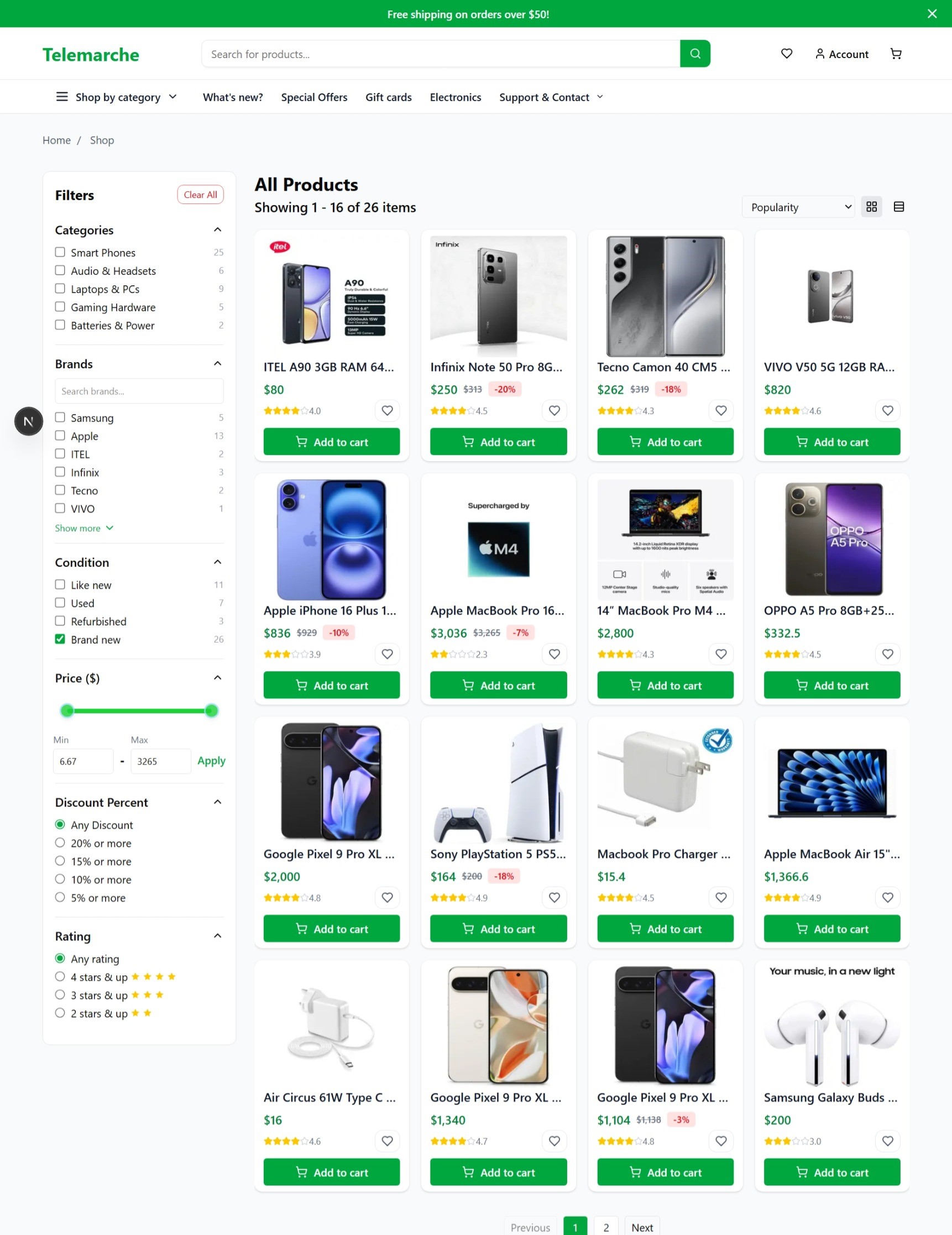 Telemarche is an e-commerce store designed for shopping a wide range of tech gadgets and consumer electronics, including smartphones, laptops, gaming consoles, headphones, mobile accessories, and smart home devices. With a mobile-first approach, it offers a seamless and engaging shopping experience accessible via smartphones and tablets, enabling customers to quickly browse product categories, apply various filters such as price range, brand, discount percent, rating, and specifications, and securely make purchases using their debit card or via USDT stablecoins. It features options that allow global international shoppers to view prices in their local currency and in their preferred language.
